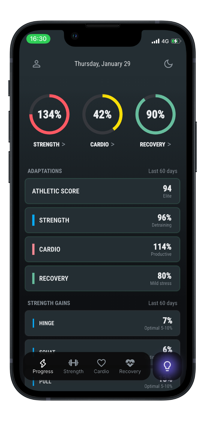 Strength training doesn't have to be complicated. Cardio doesn't have to take forever. Recovery is where the magic happens. Use sports science with AI coaching instead of guesswork.