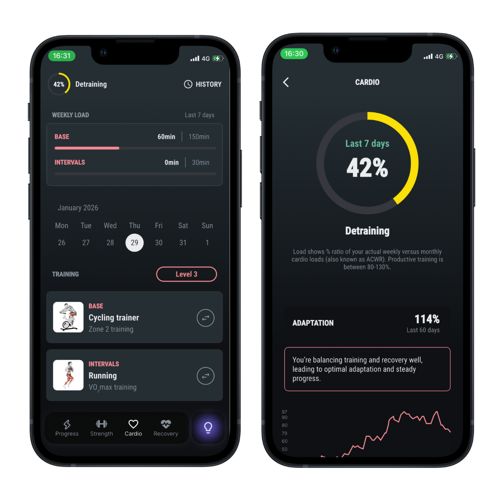 Track weekly loads and training time, 60-day progress and whether recovery leads to adaptation. Know if you are detraining, progressing, or overreaching.